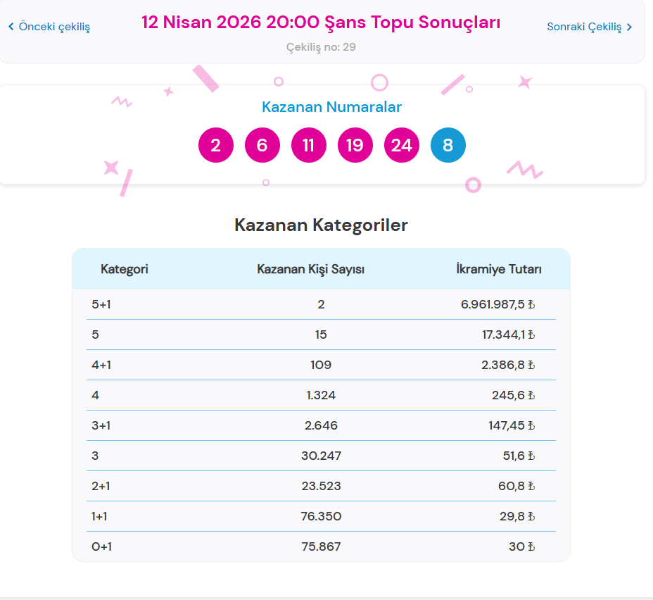 12 Nisan 2026 günü gerçekleşen canlı çekiliş sonrası sonuçlar belli oldu. Çekilişte 5+1 bilen 2 talihli tam 6.961.987,5 TL ikramiye kazandı.