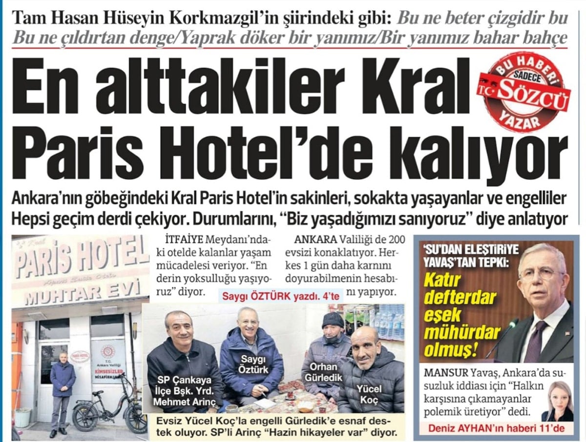 Açlık sınırının altındaki maaşlarla ev bile kiralayamayacak durumdaki emeklilerin isyanını yazan SÖZCÜ, ocak ayında bu misafirhanelerden birisini ziyaret edip ‘Paris Otel’ isimli tesiste kalan emeklilerle konuşmuştu. Şimdi o emeklilerin mayıs ayı itibarıyla sokakta kalacağını söyleyen Nazlıaka, “Valiyi iki kez aradım. Ancak kendisine ulaşamadım. Buradan sesleniyorum: Bu yurttaşlarımızı lütfen sokağa bırakmayın” dedi.