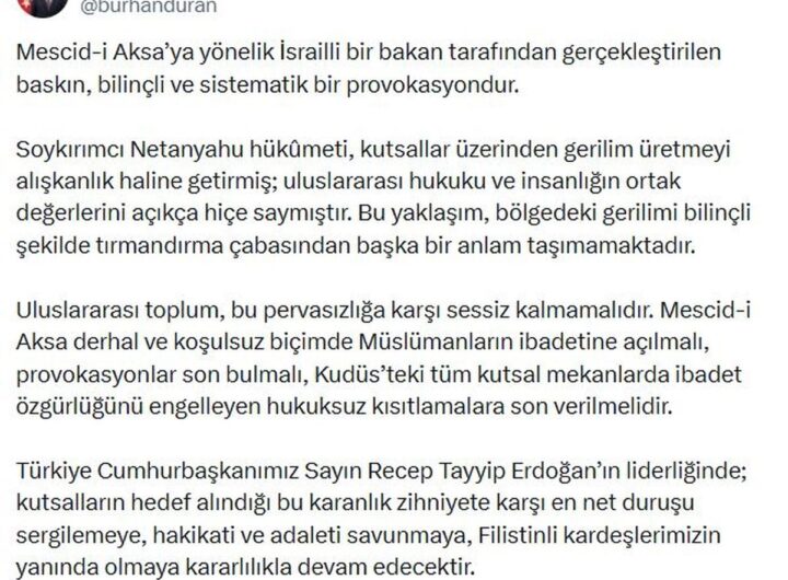 İLETİŞİM Başkanı Burhanettin Duran, "Mescid-i Aksa'ya yönelik İsrailli bir bakan tarafından gerçekleştirilen baskın, bilinçli ve sistematik bir...