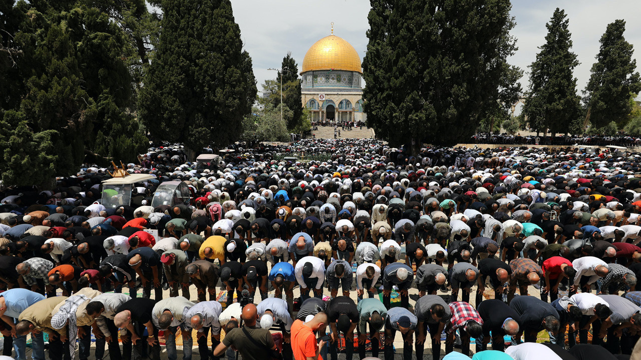 Filistinli Müslümanlar, İsrail'in İran'a saldırıları bahane göstererek kapalı tuttuğu Mescid-i Aksa'nın çevresindeki farklı bölgelerde gruplar halinde cuma...
