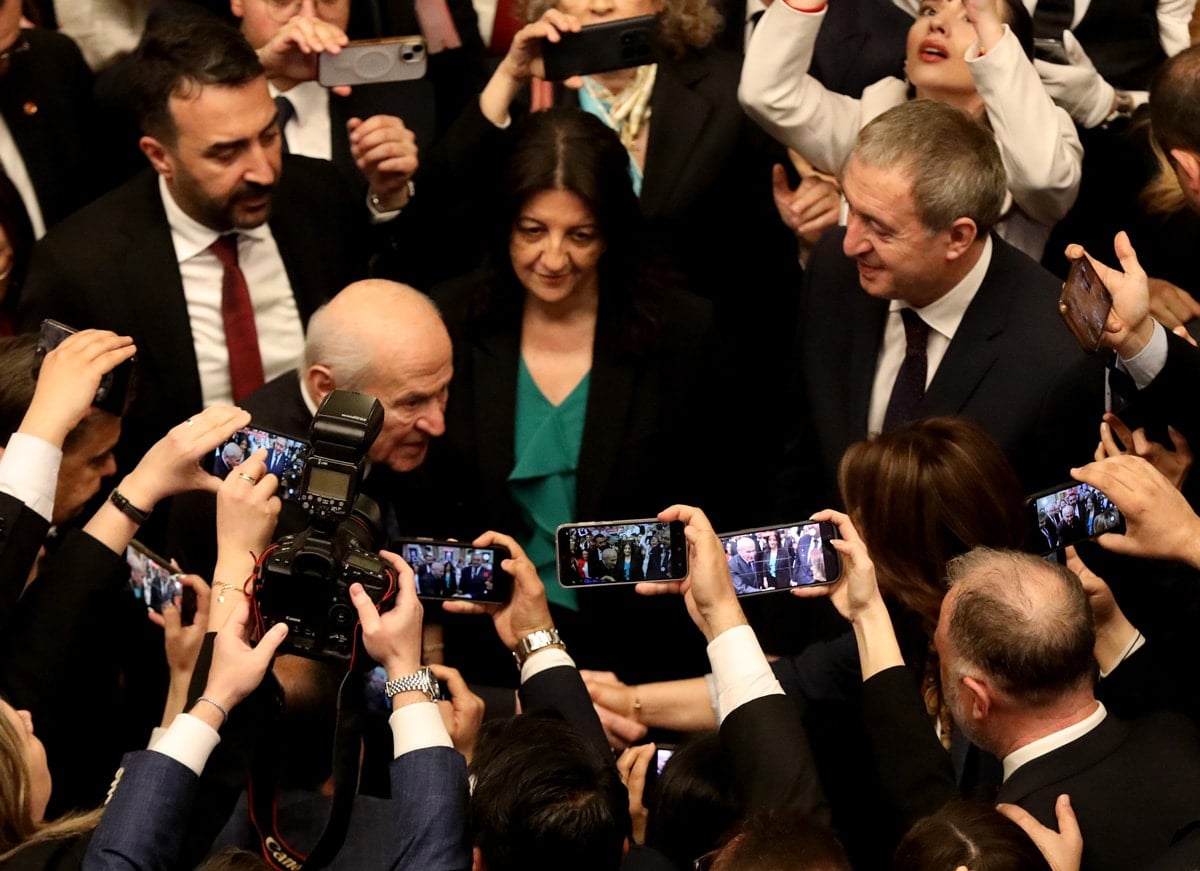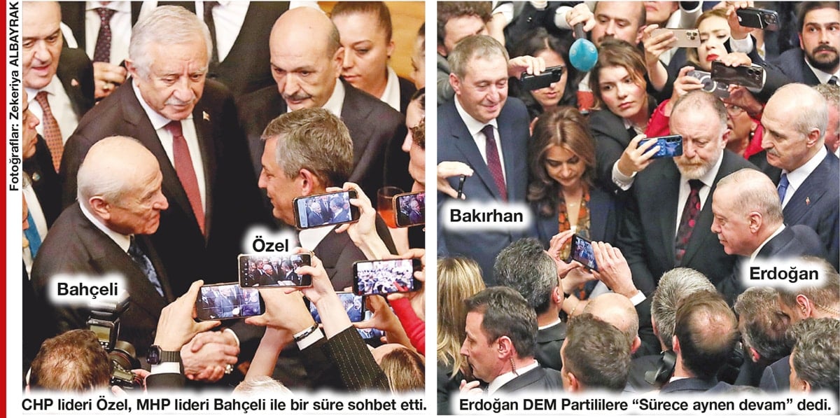 Özel ise Görüşme dediğiniz demokrasilerde olması gerekendir. Bize düşman hukuku uygulanıyor, muhatabınızla daha sonra ihtiyacınız olduğu zaman da normal bir ilişki beklemeyin” yanıtını verdi. Özel, geçen sene 19 Marttan itibaren saldırı altında oldukları için resepsiyona katamadıklarını da söyledi ve ‘’Padişah ol kral ol, Amerikan tipi başkan ol tekliflerine karşı Meclis’i kuran ve ‘Millet ne görev verirse onu yaparız’ demiş birinin koltuğunda oturan Meclis’in resepsiyonunu protesto etmez.” dedi. DEM’lilerle Erdoğan yan yana geldiğinde ‘Terörsüz Türkiye’ sürecinin tıkandığı iddialar hatırlatıldı ve Erdoğan da, “Gayet hızlı devam ediyor, tıkanma yok. Aynen devam” dedi. Erdoğan, DEM Eş Başkanı Tuncer Bakırhan’a “Masa sağlam mı?” diye sordu ve Bakırhan’da “Sağlam” cevabını verdi. Erdoğan, Meclis’ten ayrıldıktan sonra Özgür Özel’in resepsiyona katılması dikkat çekti.
