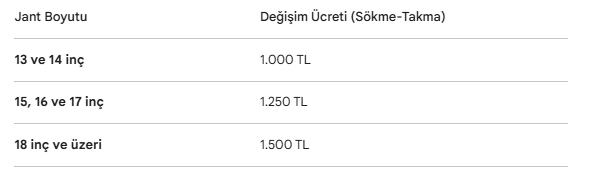 Sürücülerin yaz lastiğine geçiş sürecinde ödeyeceği servis bedelleri jant boyutuna göre değişiklik gösteriyor. Mevcut piyasa verilerine göre değişim ücretleri şu şekilde sıralanıyor: