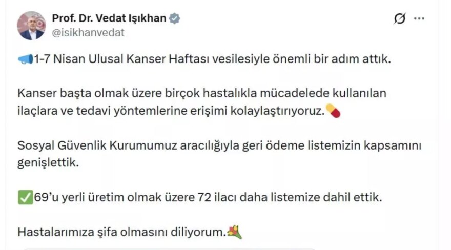 Bakan Işıkhan, sanal medya hesabından yaptığı açıklamada, “1-7 Nisan Ulusal Kanser Haftası vesilesiyle önemli bir adım attık. Kanser başta olmak üzere birçok hastalıkla mücadelede kullanılan ilaçlara ve tedavi yöntemlerine erişimi kolaylaştırıyoruz. Sosyal Güvenlik Kurumumuz aracılığıyla geri ödeme listemizin kapsamını genişlettik. 69’u yerli üretim olmak üzere 72 ilacı daha listemize dahil ettik. Hastalarımıza şifa olmasını diliyorum” dedi. İlaçlardan 6’sının kanser, 6’sının kronik immün trombositopenik purpura (ITP), 6’sının diyabet, 5’inin kolesterol, 3’ünün de multiple skleroz (MS) ilacı olduğu belirtildi.