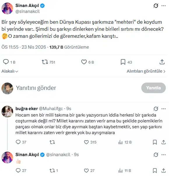 Akçıl’a bir kullanıcı, “Hocam sen bir milli takıma bir şarkı yazıyorsun iddia herkesi bir şarkıda coşturmak değil mi? Millet kararını zaten verir ama bu şekilde polemiklerin parçası olmak onlar biz diye ayırmak baştan kaybetmektir, sen yap şarkını millet kararını zaten verir gerek yok bu ayrışmalara” yanıtını verdi.