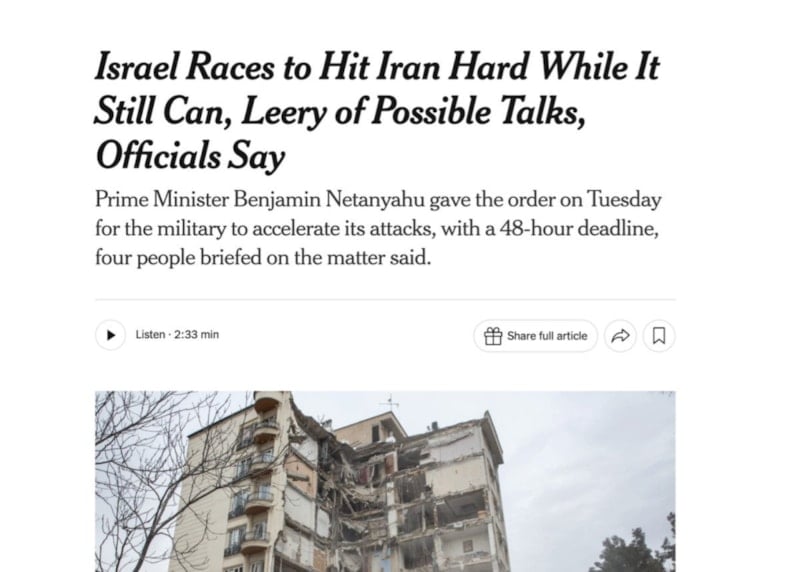 Haberde, “ABD ile İran arasında görüşme potansiyelinin artmasıyla birlikte İsrail ordusu, savaşın yakında sona erebileceği endişesiyle olabildiğince çok önemli hedefi vuruyor.” ifadeleri yer aldı.