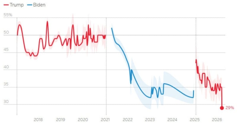 Mevcut oran, ilk başkanlık dönemindeki en düşük seviye olan yüzde 33’ün üzerinde ve Biden’ın en düşük seviyesi olan yüzde 35’in biraz üstünde kalmaya devam ediyor.