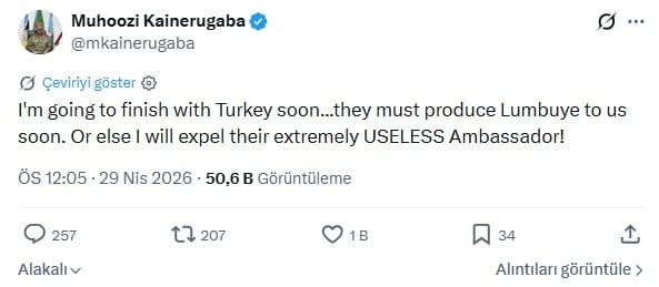 Bu sabah Türkiye’ye yönelik yeni paylaşımlarda bulunan Uganda Başkomutanı Muhoozi Kainerugaba, “Türkiye ile yakında işimi bitireceğim… Lumbuye’yi bize derhal teslim etmeliler. Yoksa onların işe yaramaz büyükelçisini sınır dışı ederim!” ifadelerini kullandı.