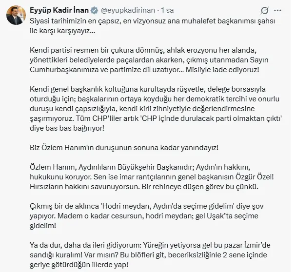 AK Parti Genel Sekreteri ve İzmir Milletvekili Eyyüp Kadir İnan, CHP Genel Başkanı Özgür Özel’in Aydın’da yaptığı açıklamalara sert sözlerle yanıt verdi.