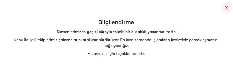 Bankanın resmi internet sitesinden yapılan açıklamada, sistemlerde geçici bir teknik aksaklık meydana geldiği belirtilerek, sorunun çözümü için ekiplerin aralıksız çalıştığı ifade edildi.