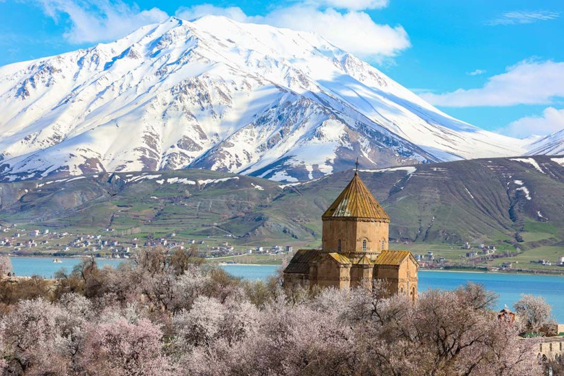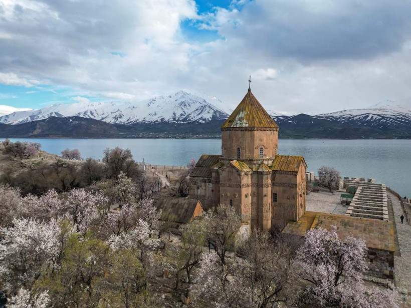 Gevaş’tan yaklaşık 20 dakikalık tekne yolculuğuyla ulaşılan ada, Artos Dağı’nın zirvesinde hâlâ erimeyen kar örtüsü ve çiçek açan ağaçların oluşturduğu renk uyumuyla dikkat çekiyor.