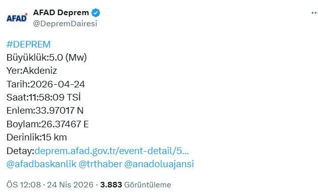 AFAD’dan alınan bilgilere göre, Akdeniz açıklarında 5 büyüklüğünde deprem meydana geldi.