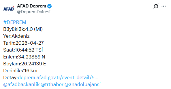 Akdeniz’de 4.0 büyüklüğünde deprem meydana geldi.