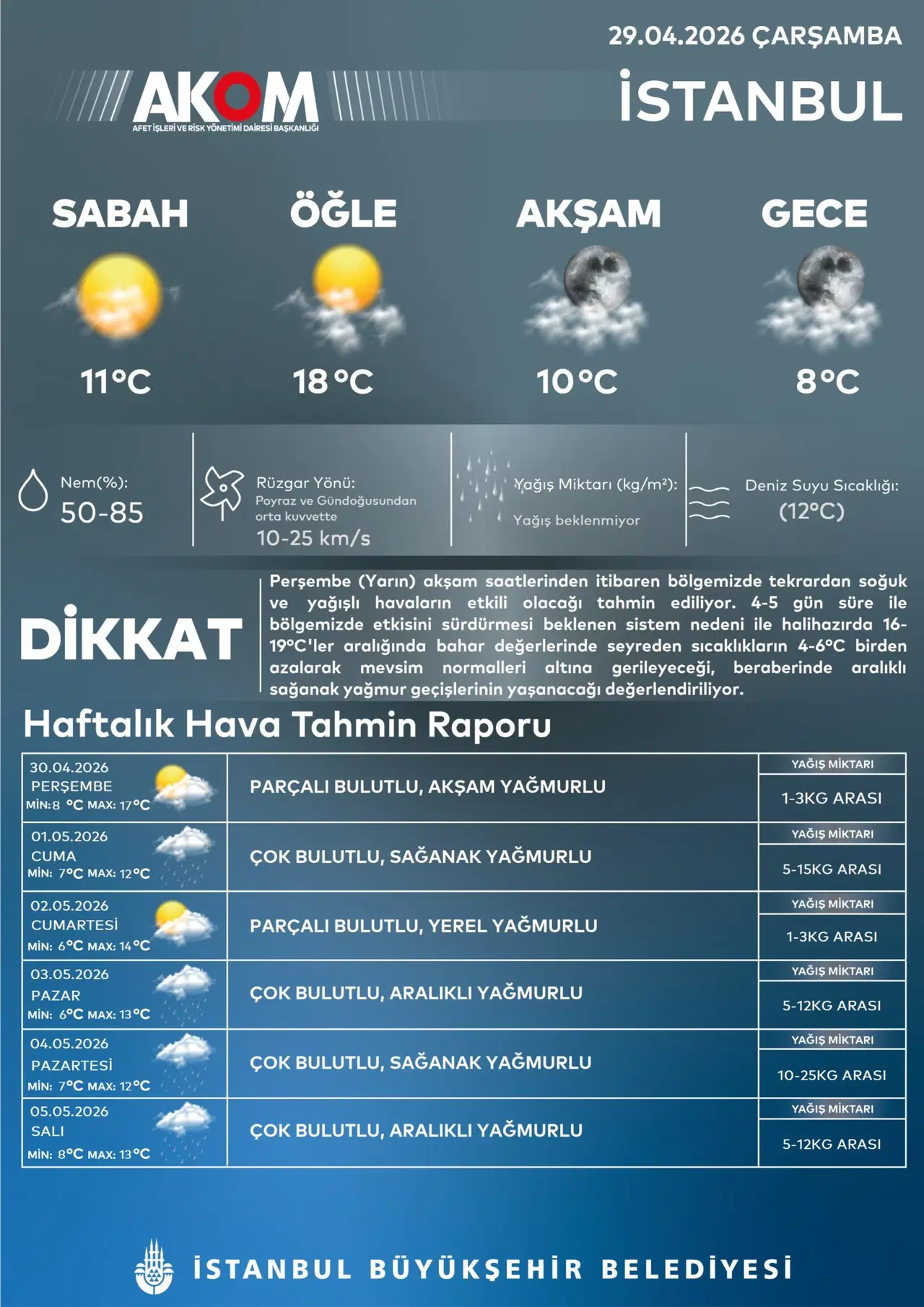 AKOM’un yayınladığı “Dikkat” notuna göre; Perşembe akşam saatlerinden itibaren bölgede tekrardan soğuk ve yağışlı havalar etkili olacak.