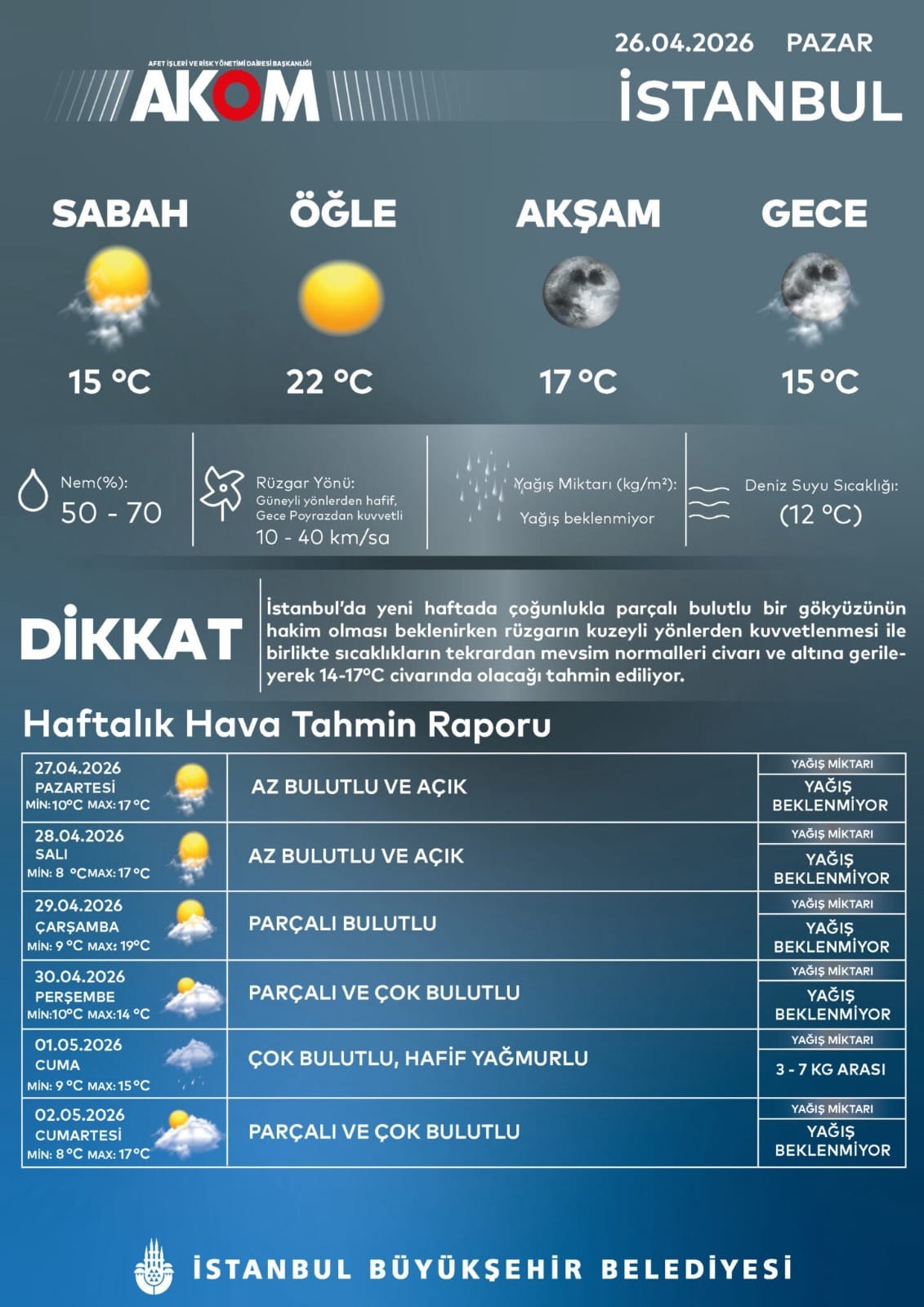 26 Nisan 2026 Pazar günü termometrelerin 22°C’yi gösterdiği kentte, Pazartesi gününden itibaren sıcaklıklarda hissedilir bir düşüş bekleniyor.