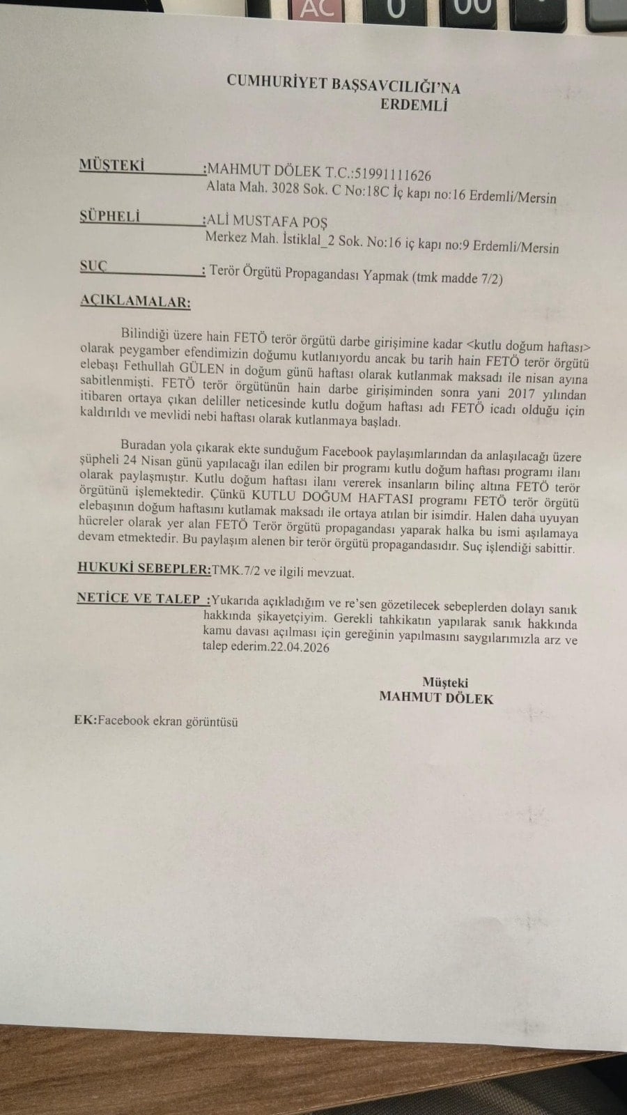 Yaşanan gelişmelerin ardından Mahmut Dölek isimli bir yurttaş, Erdemli Cumhuriyet Başsavcılığı’na suç duyurusunda bulundu. Dilekçede, kullanılan ifadenin “FETÖ propagandası” niteliği taşıdığı ve resmi kararlarla çeliştiği öne sürüldü. Başvuruda ayrıca, söz konusu terminolojinin yeniden dolaşıma sokulmasının toplumsal hassasiyetleri zedelediği ve kamuoyunda algı oluşturma amacı taşıyabileceği iddia edildi.