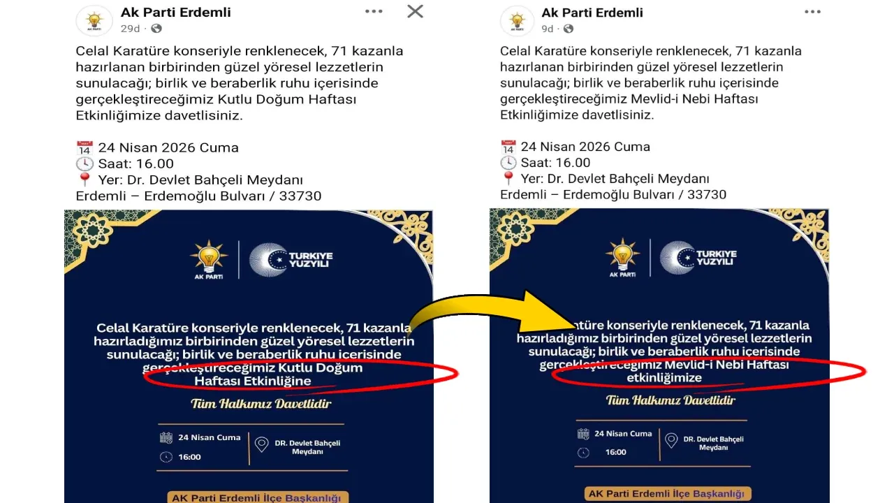 Oda TV’de yer alan habere göre Mersin’in Erdemli ilçesinde AKP İlçe Başkanlığı tarafından paylaşılan bir etkinlik davetiyesinde, “Kutlu Doğum Haftası” ifadesinin yer alması büyük tepki çekti.