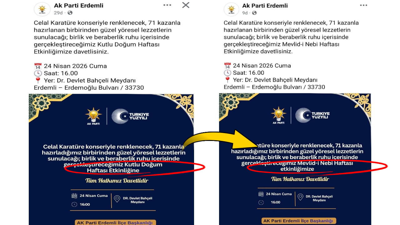 AKP Erdemli İlçe Başkanlığı tarafından duyurulan etkinlikte, sanatçı Celal Karatüre konseri ve yerel lezzetlerin sunumu planlandı. Ancak ilk paylaşılan afişte yer alan “Kutlu Doğum Haftası Etkinliğimize davetlisiniz” ifadesi, kamuoyunda tepkiye neden oldu. Söz konusu ifade, daha önce “FETÖ ile ilişkilendirildiği” gerekçesiyle kaldırılan ve yerine “Mevlid-i Nebi Haftası” kullanılan terminolojiyi yeniden gündeme getirdi.