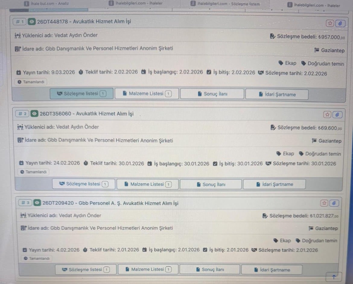 11 Kasım 2025 tarihinde Gaziantep Büyükşehir Belediyesi Personel A.Ş. tarafından gerçekleştirilen avukatlık hizmet alımı ihalesi, 450 bin TL bedelle AKP Gaziantep İl Gençlik Kolları Başkan Yardımcısı Avukat Mustafa Berkan Sönmez’e verildi. 2026 yılında da benzer uygulamaların sürdüğü görüldü. Gaziantep Büyükşehir Belediyesi Danışmanlık ve Personel Hizmetleri A.Ş. tarafından 9 Mart’ta yapılan 957 bin TL’lik avukatlık hizmet alımı ihalesi, AKP İl Gençlik Kolları Seçim İşleri Başkanı Avukat Vedat Aydın Önder’e verildi. Önder’e ayrıca 2 Ocak’ta 1 milyon 21 bin 827 TL, 30 Ocak’ta ise 69 bin 600 TL tutarında iki ayrı ihale daha verildiği ortaya çıktı. Böylece iki AKP’li yöneticiye toplam dört ihalede 2 milyon 498 bin 427 TL’lik kamu kaynağı aktarıldı.