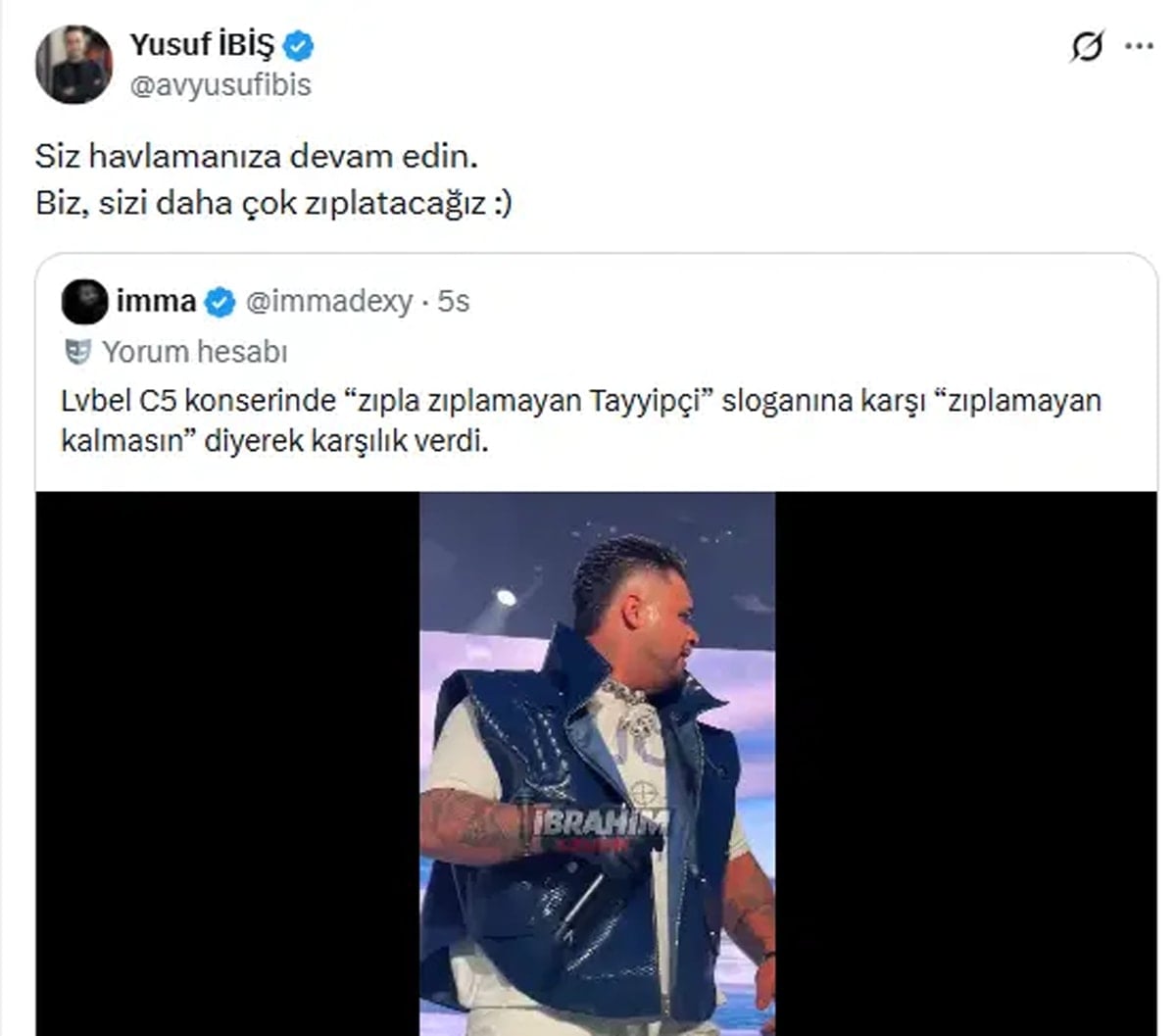 AKP Gençlik Kolları Başkanı Yusuf İbiş, rapçi Lvbel C5’in konserinden “zıplamayan Tayyipçi” sloganlarının olduğu videoyu sosyal medya hesabından paylaştı.