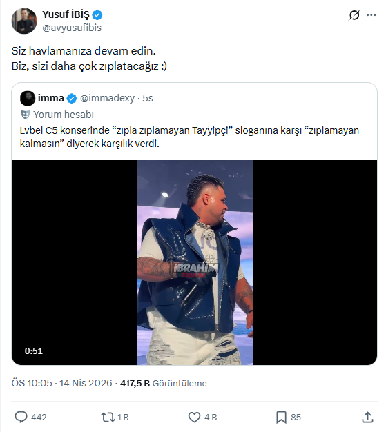 AKP Gençlik Kolları Başkanı Yusuf İbiş, ünlü rapçi Lvbel C5’in konserinden “zıplamayan Tayyipçi” sloganlarının olduğu videoyu sosyal medya hesabından paylaştı.