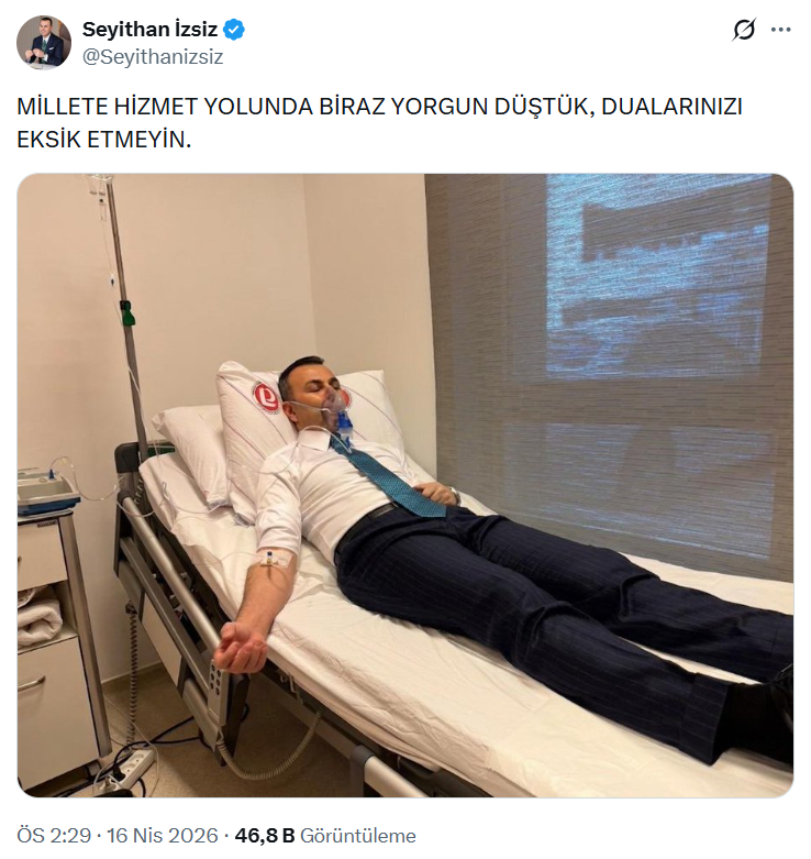 İzsiz, söz konusu paylaşımında “Millete hizmet yolunda biraz yorgun düştük, dualarınızı eksik etmeyin.” yorumunda bulundu.