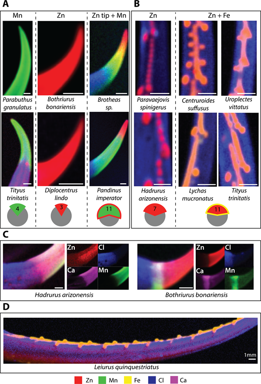 Deathstalker akrebi gibi özellikle tehlikeli türleri barındıran Buthidae ailesinden olan örneklerin özellikle kıskaç dişlerinde demir metalinin yoğunlaştığı tespit edildi. Diğer bazı türlerin ise zehir kanallarının tamamen çinkoyla kaplı olduğu görüldü.