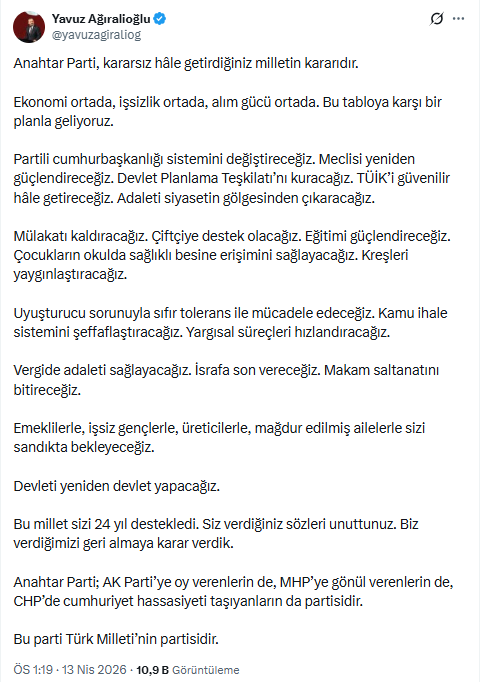 Anahtar Parti lideri Yavuz Ağıralioğlu, ittifak söylemlerinin ardında dikkat çeken bir açıklama yaptı. “Anahtar Parti; AK Parti’ye oy verenlerin de, MHP’ye gönül verenlerin de, CHP’de cumhuriyet hassasiyeti taşıyanların da partisidir” diyen Ağıralioğlu’nun bu paylaşımı ‘İttifaklara kapıyı kapattı, tek başına yol yürüyecek’ şeklinde yorumlandı.