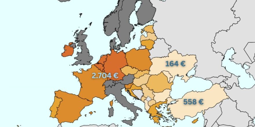 Türkiye 558 euro ile 32 ülke arasında 28. sırada yer alıyor. Türkiye’nin altında yalnızca Bulgaristan (551 euro), Arnavutluk (408 euro), Moldova (279 euro) ve Ukrayna (164 euro) bulunuyor.
