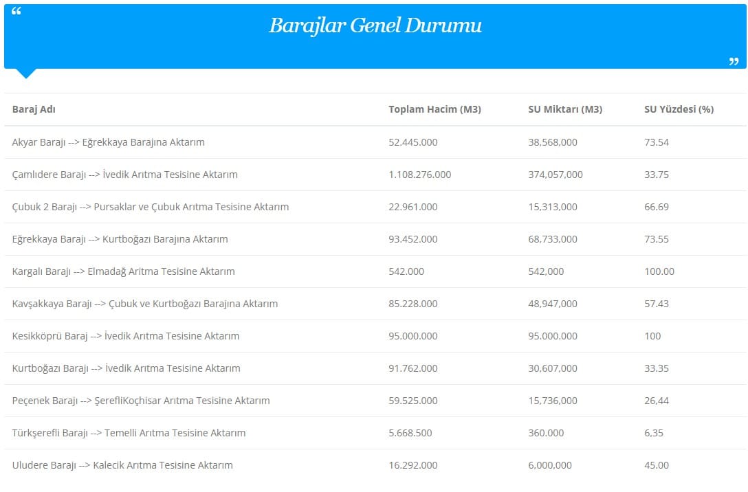 ASKİ’nin 16 Nisan 2026 raporuna göre, Ankara’ya su sağlayan barajlardaki son doluluk oranları şu şekilde: