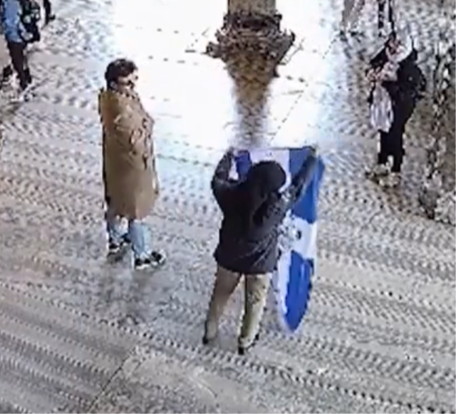 Bir süre sonra gruptaki turistlerden biri, ziyaretçilere açık olan üst katta montunun içinden çıkardığı çift başlı kartal figürlü Bizans bayrağını açtı. Fotoğraf çekiminin ardından bayrak, yanındaki diğer kişiye verildi. Onun da fotoğraf çektirmesinin ardından güvenlik güçleri duruma müdahale etti.