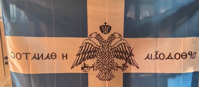 Yapılan incelemede bayrak üzerinde “Ya Ortodoks ol ya da öl” ifadesinin yer aldığı belirlendi.