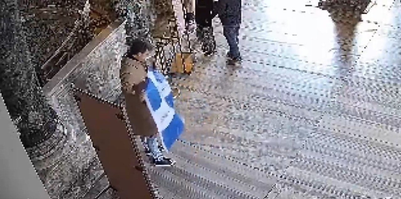 Çağdaş Evren Şenlik’in haberine göre, Ayasofya-i Kebir Cami-i Şerifi’ne turist olarak gelen iki Yunanlı, ellerinde taşıdıkları dini ve ideolojik içerikler taşıyan bayrağı açarak poz verdi. İki ismin birbirinin fotoğrafını çekmesinin ardından provokasyona görevliler tarafından müdahale edildi.