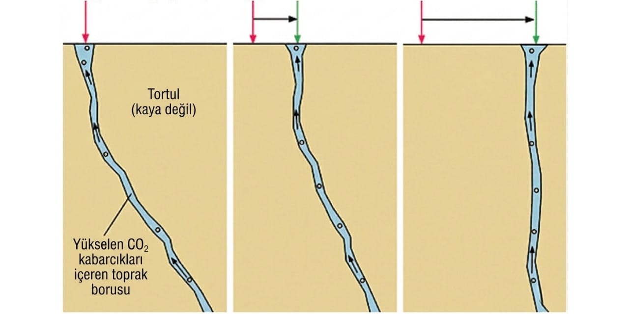Eğimli bu kanalda su ve gaz hareketi, kanalın üst kısmında erozyona yol açarken alt kısmında tortu birikiyor. Bu eşit olmayan aşınma, kanalın yüzeyde açıldığı noktayı zamanla kaydırıyor; böylece yüzey kaynağı da yer değiştirmiş gibi görünüyor. Modele göre çamur gözü, doğrudan yeraltı su ve gaz kaynağının üstüne geldiğinde duracak.
