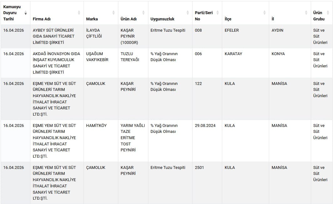 Aydın’ın Efeler ilçesinde faaliyet gösteren Aybey Süt Ürünleri firmasına ait İlayda Çiftliği markalı kaşar peynirlerinde eritme tuzu tespit edildi. Benzer bir durum Konya Karatay merkezli Akdağ İnovasyon Gıda şirketinde de yaşandı.