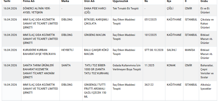 İncelenen diğer ürün gruplarında, insan sağlığına uygun olmayan içeriklere rastlandığı ifade edildi. Bitkisel macunlar, takviye edici gıdalar, çikolatalar ve bazı alkolsüz içeceklerde, gıda maddelerinde kullanımı yasak olan ilaç etken maddeleri saptandı. Ayrıca; fıstıklı sarma, tatlı toz biber ve bazı süt ürünlerinde, gıdada kullanılmasına izin verilmeyen boyaların veya yabancı bitkisel yağların kullanıldığı listede yer alan diğer bulgular arasında yer aldı.