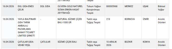 Bitkisel yağlar kategorisinde yapılan analizlerde, özellikle zeytinyağı ürünlerinde standart dışı uygulamalar görüldü. “Natürel Sızma Zeytinyağı” etiketiyle piyasaya arz edilen bazı ürünlerin içeriğine, daha düşük kaliteli zeytinyağlarının yanı sıra farklı tohum yağlarının karıştırıldığı teyit edildi. Benzer şekilde, süzme çiçek ballarında da doğal içeriği yansıtmayan taklit ve tağşiş uygulamalarının yapıldığı bildirildi.