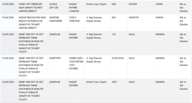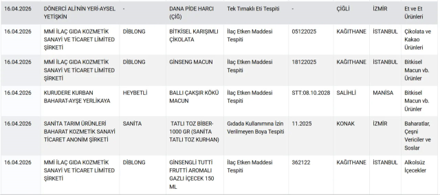 Son olarak 16 Nisan tarihli liste güncellenirken, bal, zeytinyağı, pide, kaşar peyniri, baharat, tatlı, tereyağı, kebap, köfte ve sucuk gibi birçok üründe uygunsuzluk tespit edildi.