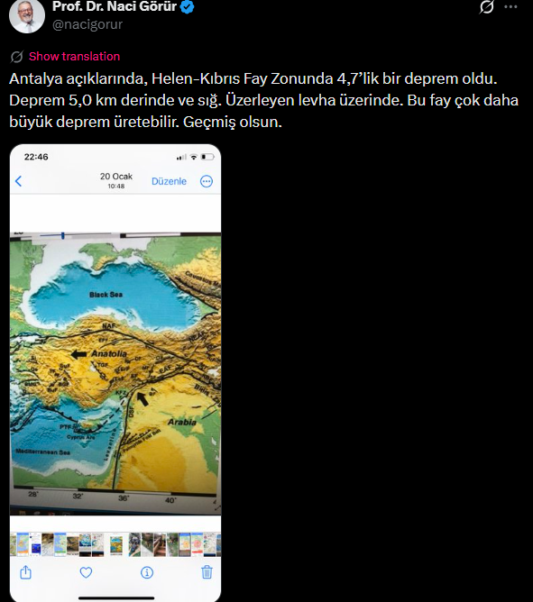 Bölgedeki sismik hareketliliği değerlendiren Yerbilimci Prof. Dr. Naci Görür, sosyal medya hesabı üzerinden bir uyarı mesajı paylaştı. Sarsıntıların Helen-Kıbrıs Fay Zonu üzerinde ve sığ bir derinlikte oluştuğunu belirten Görür, bu fay sisteminin çok daha büyük sarsıntılar üretebilecek kapasite barındırdığının altını çizdi.