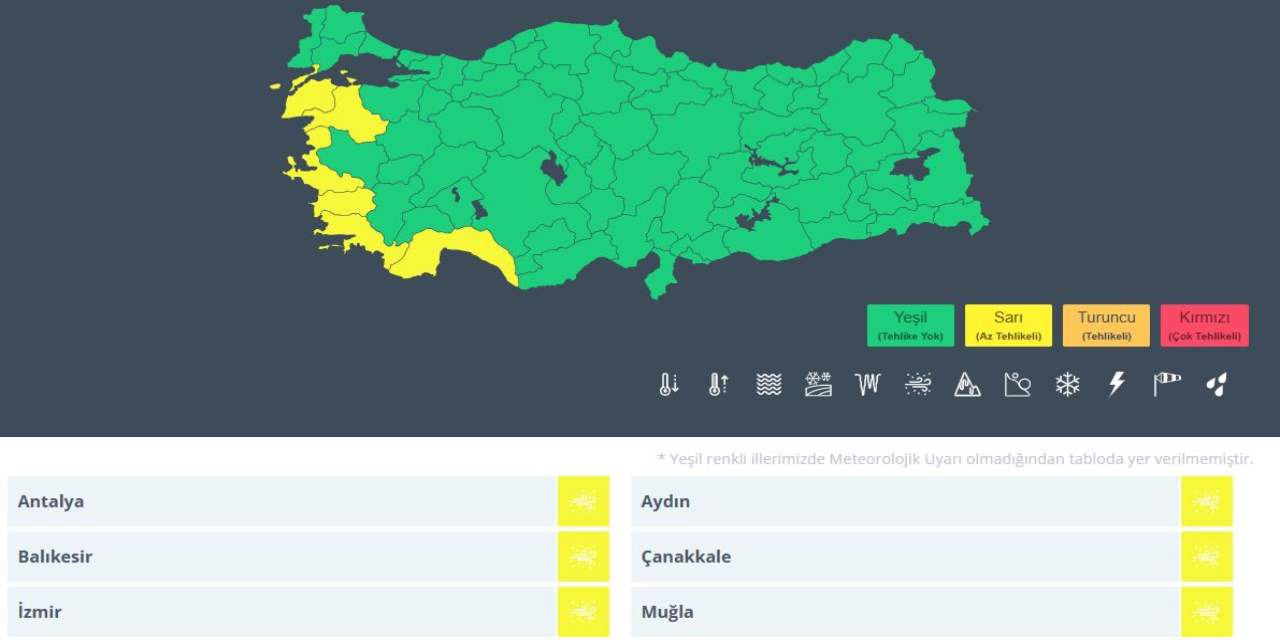 Mevcut durumda Kuzey Afrika kaynaklı toz taşınımı, Kıyı Ege ve Akdeniz kıyılarında etkisini sürdürüyor.