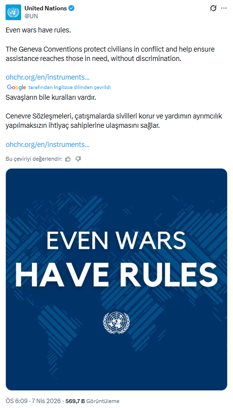 Birleşmiş Milletler‘in resmi sosyal medya X hesabından yapılan açıklamada, taraf veya isim belirtilmeden savaş kuralları ve Cenevre Sözleşmesi hatırlatıldı.