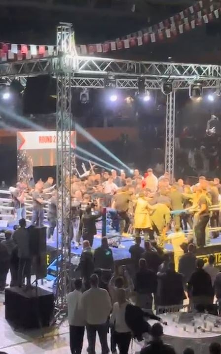 Sandalyelerin kullanıldığı, tekme ile yumrukların atıldığı kavga ve arbedeye özel güvenlik personeli güçlükle müdahale etti. Ringe çıkan onlarca kişinin karışmasıyla büyüyen kavga üzerine karşılaşma yarıda kesildi.