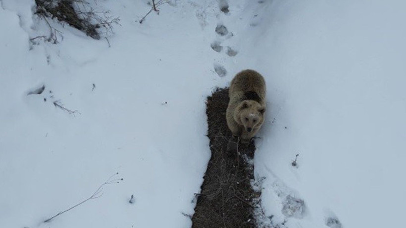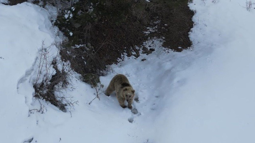 Drona karşı net bir tepki vermeyen boz ayı, ikinci bakışın ardından hızla bölgeden uzaklaştı.