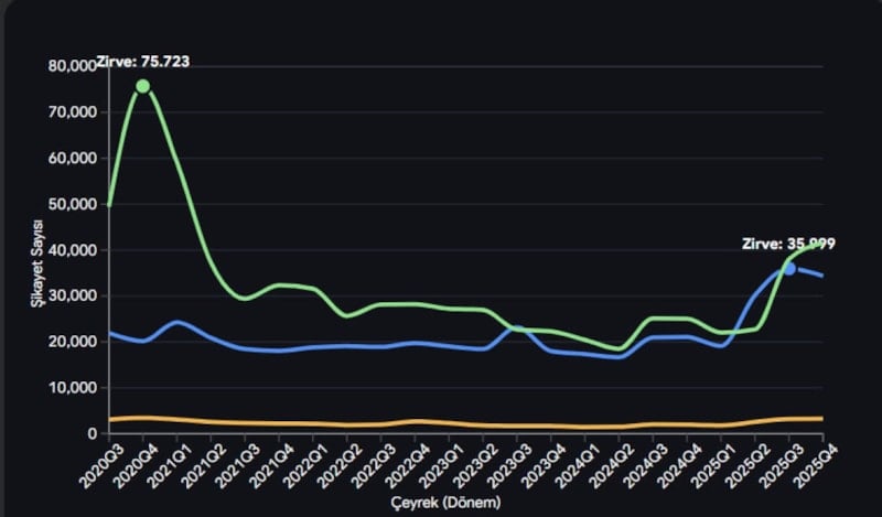2024 ortalarında 16 bin bandında olan mobil şikayetler, 2025’in son çeyreğinde 34 bin 368’e ulaşarak 41 bin 516 şikayet alan internet servis sağlayıcılarının hemen ensesine yerleşti.