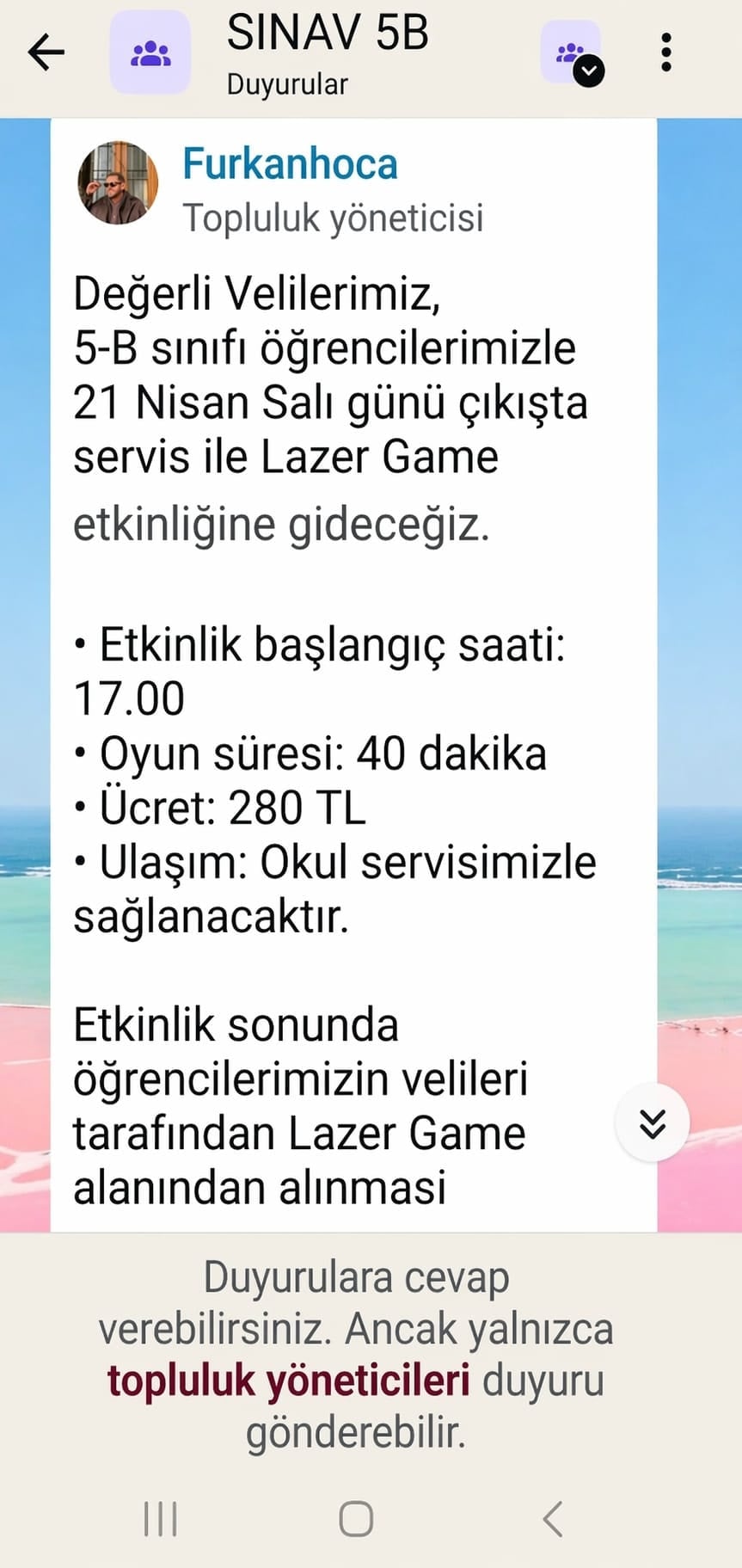 Etkinliğe ilişkin detayların, okulun “SINAV 5B” isimli WhatsApp duyuru grubundan velilere gönderilen mesajla paylaşıldığı öğrenildi. Mesajda organizasyonun 21 Nisan Salı günü (dün) saat 17.00’de başladığı, 40 dakikalık oyun için öğrenci başına 280 TL ücret alındığı ve ulaşımın okul servisiyle sağlandığı belirtildi. Ayrıca duyuruda, etkinlik sonunda öğrencilerin velileri tarafından oyun alanından teslim alınmasının istendiği ifade edildi.