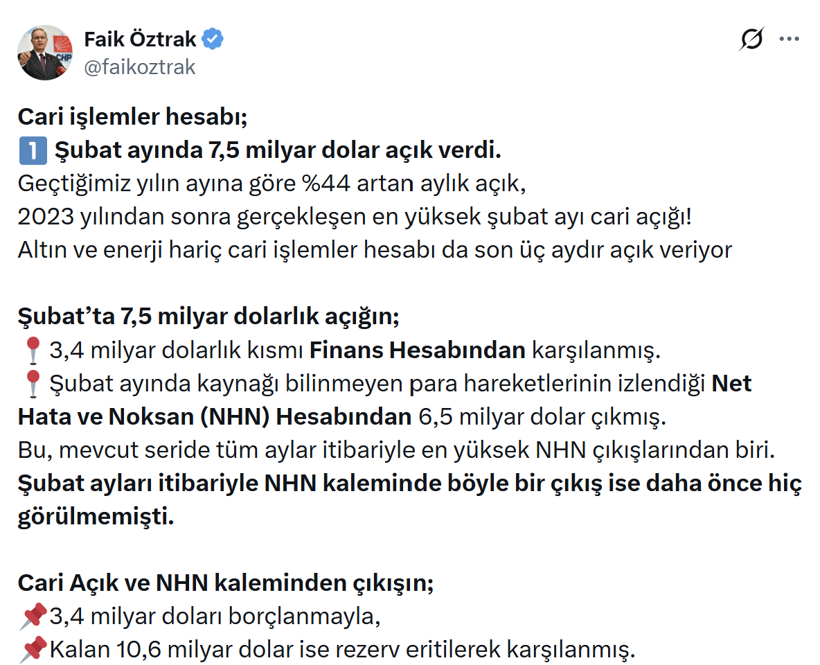 Türkiye ekonomisindeki kırılganlıklar, açıklanan resmi verilerle bir kez daha gündeme oturdu. CHP Tekirdağ Milletvekili, NATO-PA Ekonomi ve Güvenlik Komitesi Başkanı ve eski Hazine Müsteşarı Faik Öztrak, şubat ayına ilişkin ödemeler dengesi verilerini sosyal medya platformu X üzerinden yaptığı çarpıcı bir analizle kamuoyuyla paylaştı. Öztrak, X hesabından yaptığı değerlendirmede cari işlemler hesabındaki devasa açık ve kaynağı belirsiz para çıkışlarının ekonomideki riskleri en üst seviyeye taşıdığını belirtti.