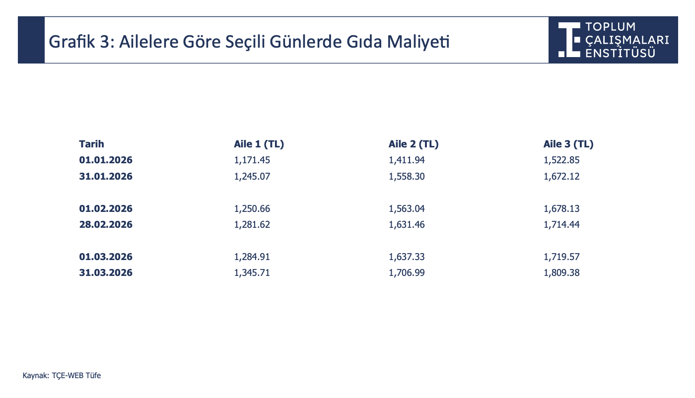 Ocak ayında bile bebekli bir ailenin (Aile 1) günlük maliyeti bin 245 lirayken, Mart sonunda bu rakamın çok daha yüksek seviyelere ulaştığı ifade edildi.