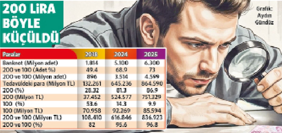 Bir önceki yıl 200 ve 100 TL’nin banknot adedi içindeki payı yüzde 68.9; 200 TL’nin emisyon tutarı içindeki payı yüzde 81.3, 100 TL’nin payı yüzde 14.3’tü. Bu veriler, 100 TL’nin alım gücünün hızla değer yitirdiğini, onun yerini 200 TL’lik banknotların almaya başladığını gösteriyor. Bankalar da 200 TL’lik banknotlara olan talep nedeniyle bankamatiklere ağırlıklı olarak 200 TL koymaya başlamıştı.