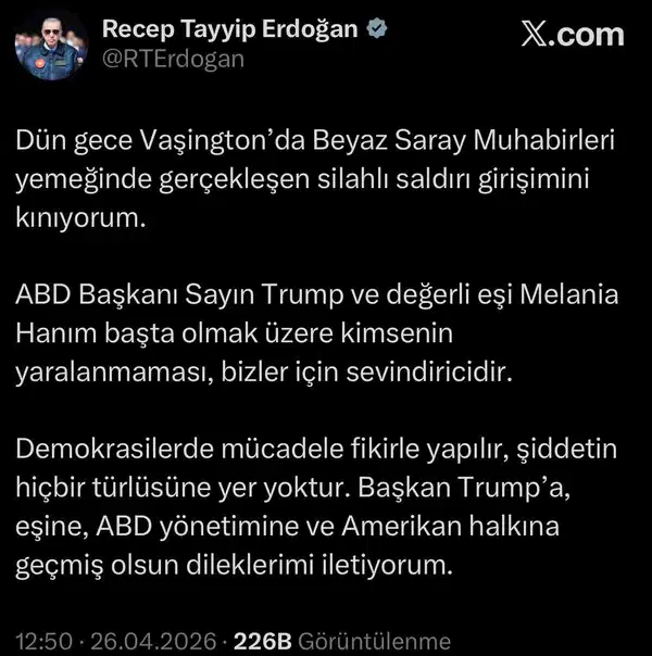 AKP Genel Başkanı ve Cumhurbaşkanı Erdoğan, ABD Başkanı Donald Trump’ın katıldığı bir yemekte yaşanan silahlı saldırı girişiminin ardından ‘geçmiş olsun’ mesajı yayımlayarak, saldırıyı kınadığını açıkladı.