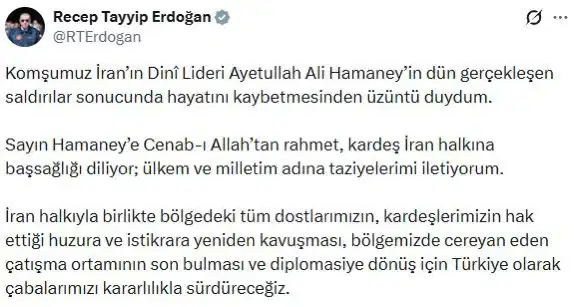 Erdoğan’ın Hamaney’e yönelik suikast sonrası yaptığı paylaşım.