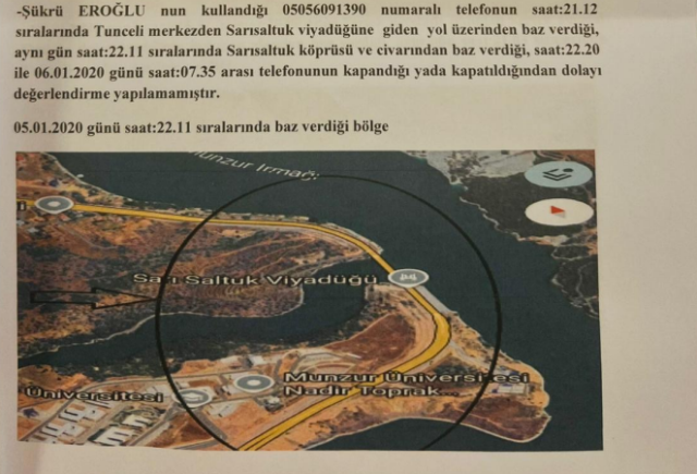 Hazırlanan HTS (baz istasyonu) inceleme raporunda, olay günü ve öncesinde şüphelilere ait telefonların sinyal verdiği bölgeler detaylı şekilde analiz edildi. Raporda, özellikle 05 Ocak 2020 tarihinde birçok telefon hattının Tunceli merkez ve Sarı Saltuk Viyadüğü çevresinde yoğunlaştığı tespiti öne çıktı.